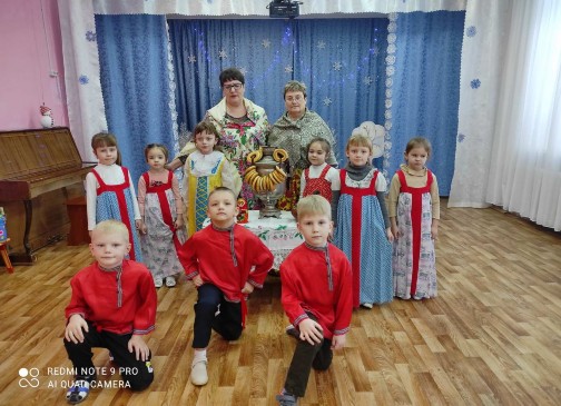 Дети подготовились и праздник «Рождественские посиделки» в русском народном стиле прошел ярко, незабываемо! Во время праздника дети соревновались в чтении нескладушек, раскрывали свои таланты в задорной русской пляске, колядовали и получали угощения. По русской традиции русские посиделки всегда сочетались с подвижными играми. Дети с удовольствием играли в русскую народную игру «Шел козел по лесу». А самыми любимыми персонажами были ряженые. На праздник в детский сад пришли Колядовщик с капризной Козой, а продолжением праздника была встреча со школьниками на воздухе. Школьники под руководством учителя подготовили шуточную сценку с ряжеными «Цыган, медведь и коза» и русскую народную игру «Шапка». Закончился праздник задорной русской пляской.